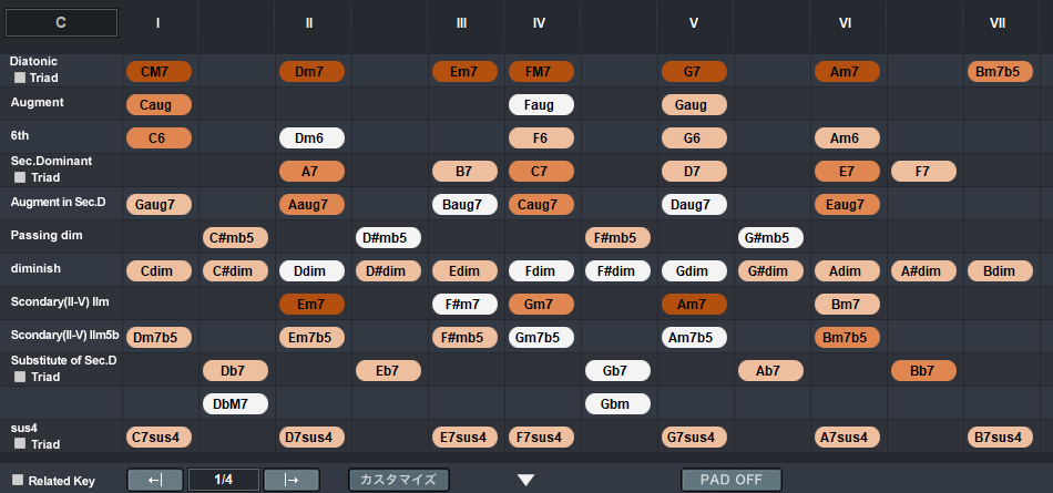 CHORD PADは、作成する楽曲のキー(調)と現在指定しているコードを基準に、次に続く最適なコードや音楽理論上使えるコードを、コードの種類やディグリーネームごとに提示。