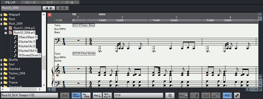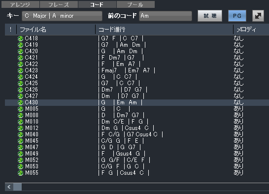 楽曲制作に使用できる素材を一元管理するメディアブラウザでMIDIアレンジデータやMIDIフレーズデータ、AUDIOフレーズデータ(ACIDファイル)、スタンダードMIDIファイル、AUDIOデータとコード進行を選び、ドラッグ & ドラッグでソングエディタへ貼り付けて伴奏作成やアレンジ、リミックスが行えます。