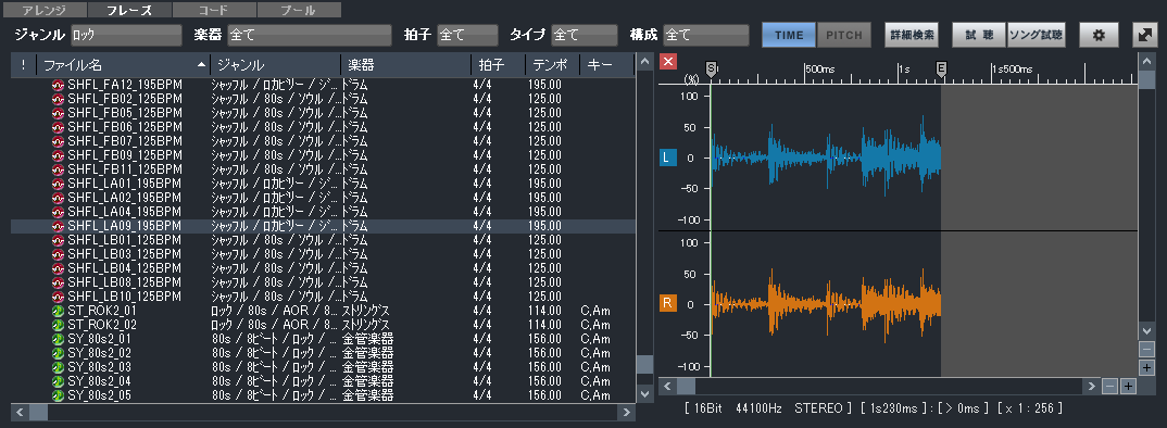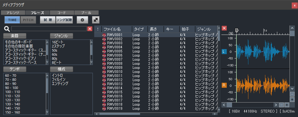 キーワード検索や、フレーズのジャンルやテンポ、フレーズで使用している楽器や構成でフィルタリングして表示や検索が可能となり、目的のフレーズを素早く探し出せます。