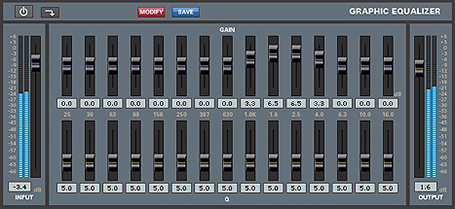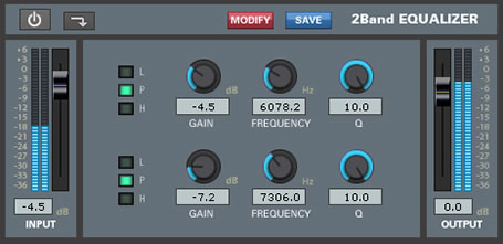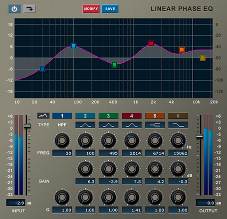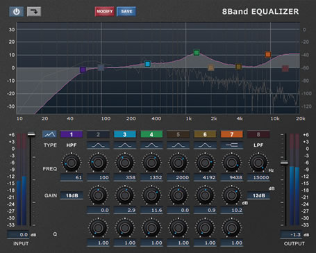 最大6つの周波数帯に対して、Peaking、Lo Shelving、Hi Shelving、Lo Pass、Hi Passの5種類のイコライザで音質を調整します。