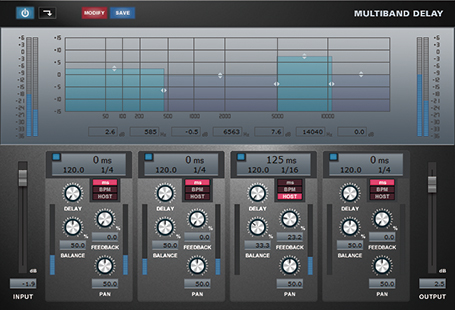 4つに分割された周波数帯域に対して帯域別にディレイをかけます。バンドスプリッターにFIRフィルタを使用するテクノロジーで、周波数による位相差が生じません。