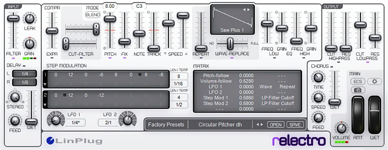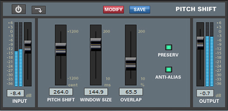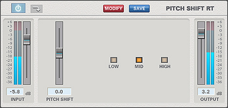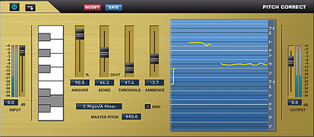 リアルタイムにピッチを検出して、ピッチの揺れやずれを補正します。画面上でのキー指定や音程のON/OFFの他、MIDI入力でも音程の修正が行え、積極的にピッチを変更してハーモナイザーのような使用も可能です。