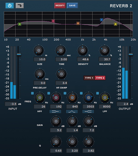 サウンドに残響効果(リバーブ)をプラスして、空間の大きさをシミュレートします。リバーブ音にEQをかけることができます。