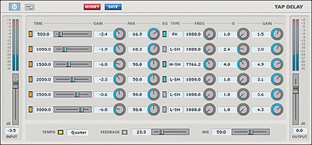 6段のタッピングディレイです。ソースに対してパラメータの異なるディレイを6つまでかけることができ、複雑なディレイを作り出すことができます。