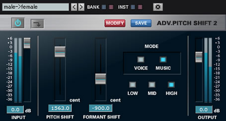 ピッチとフォルマントを独立してコントロール。ボーカル素材などのキャラクター変更や、倍音成分だけをシフトさせることでボーカルパート以外の楽器音に対しても効果があります。