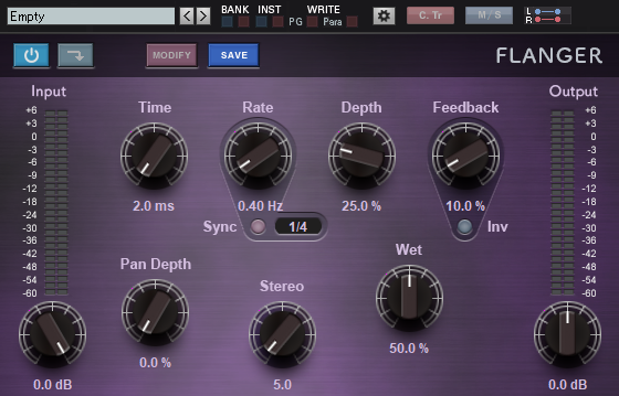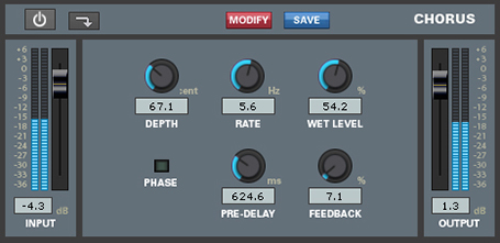 長いディレイタイムでコーラス、短いディレイタムの設定でフランジャーの効果を与えます。