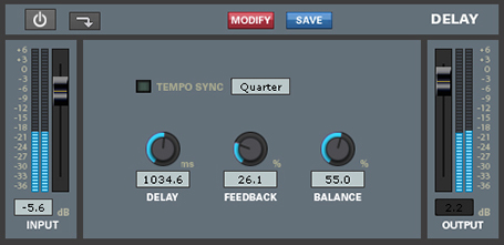 サウンドにディレイ(エコー)効果をプラスします。ディレイタイムをLFOで変調させ、フランジャーやコーラスエフェクト、テープエコーのような効果も与えられます。