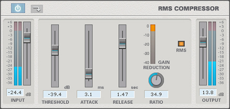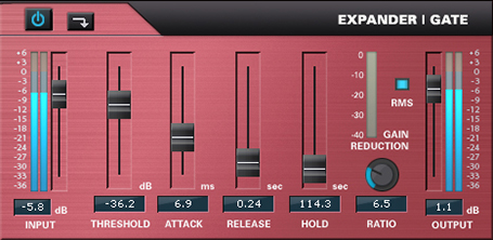 THRESHOLD値を下回る信号を圧縮してTHRESHOLD値を上回る信号を強調しダイナミックレンジを広げます。THRESHOLD値を下げ、Ratioを最大にするとノイズゲートとしても使用できます。