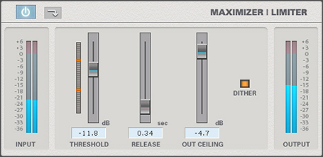 THRESHOLD値でリミッティングしたサウンドを、設定したレベルまで持ち上げて全体の音量・音圧をアップさせます。