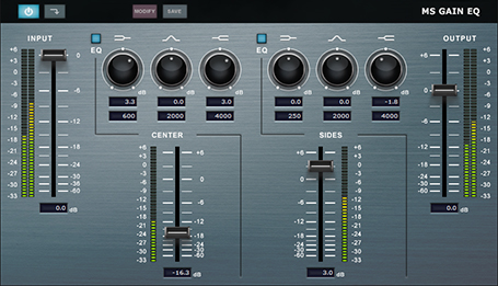 ステレオ信号を MID (CENTER) とSIDEに分解し、MID、SIDE個別に音量調整やEQをかけることができます。ステレオイメージの補正やアンビエント感の調整、ステレオイメージでのEQ補正などに使用できます。