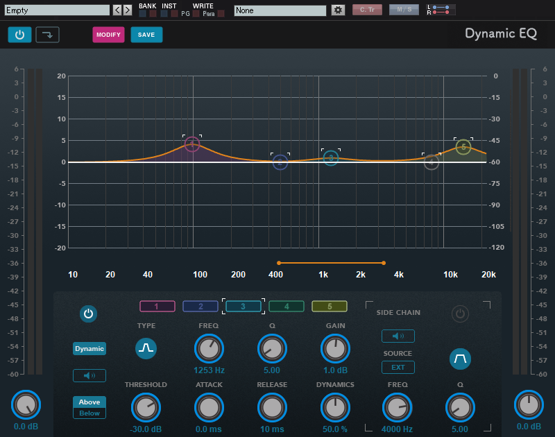 音の状態に追従して効果が効くイコライザー。各バンドで設定した周波数帯のゲインが高くなればEQを効かせる、あるいは設定した周波数帯のゲインが低くなればEQを効かせることができます。