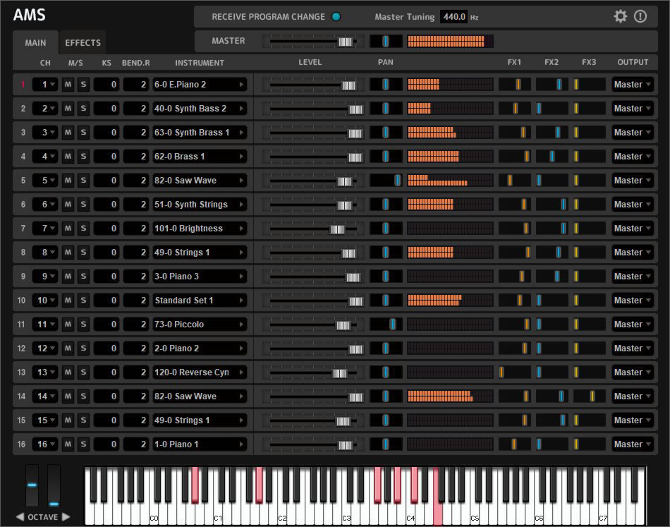 2系統のFXバスが利用できるので、グループ化した上でエフェクト処理を行うことで、まとまりのあるサウンドを作ることができます。