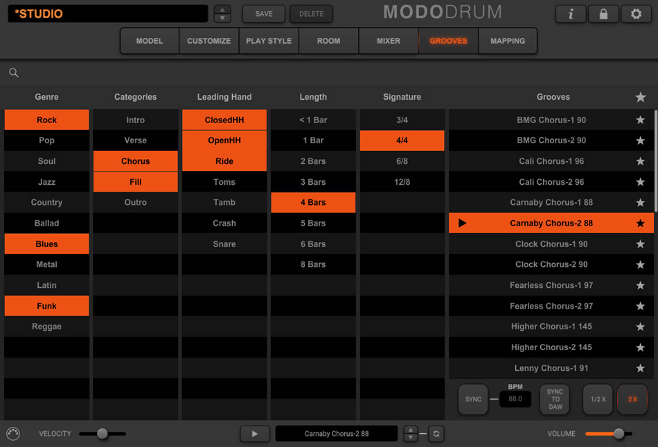 - ドラム・サウンド全体をコントロール可能:ドラム・キット、演奏スタイル、スティック、部屋鳴り、エフェクト