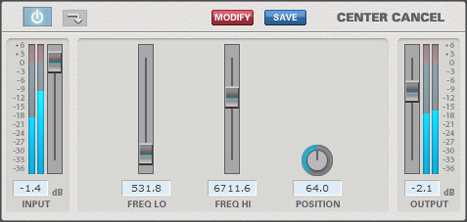 ボーカルなど設定位置にある音の中から設定した帯域の周波数成分を消去します。