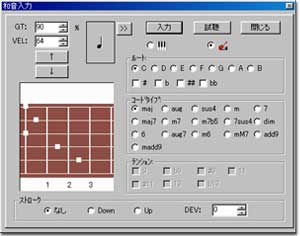 入力する際には、Vel値、GT値、ストロークの種類を指定することができます。また、和音を構成している個々の音にデビエーション(Del値:発音のタイミング)を付けることによって、ギターのストローク感を出すことができます。 |