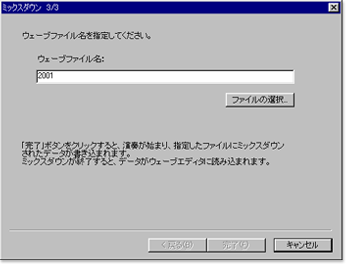 まず、ミックスダウンウィーザードを用いて、作成した曲データをWAVEファイルにミックスダウン(WAVEファイルとMIDIファイルをミックスし、1つのWAVEファイルにする)します。