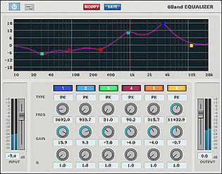 最大6つの周波数帯に対して、Peaking、Lo Shelving、Hi Shelving、Lo Pass、Hi Passの5種類のイコライザで音質を調整します。