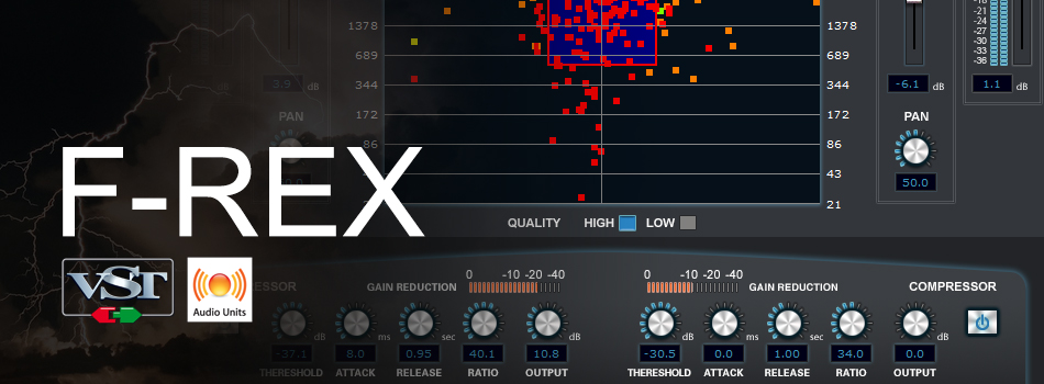 定位と周波数の特定の領域をマウス操作で選択し、その領域のインサイド部分とアウトサイド部分を独立して、音量やパンポットを直感的に調整したり、搭載するコンプレッサーやリバーブを使いエフェクト処理が可能です。