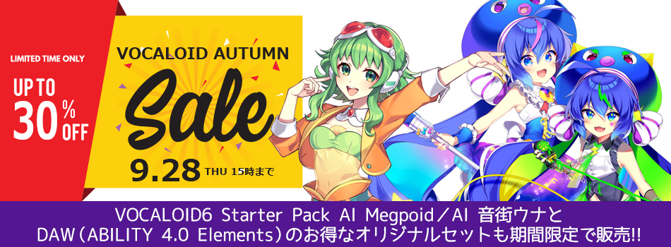「ABILITY 4.0 Elements」と「VOCALOID6 Starter Pack AI Megpoid」、「VOCALOID6 Starter Pack AI 音街ウナ」をそれぞれセットにしたDAWセットや、「VOCALOID3/4ライブラリ」のすぐに使えるダウンロード版を最大30%OFFのスペシャル価格でご提供します。