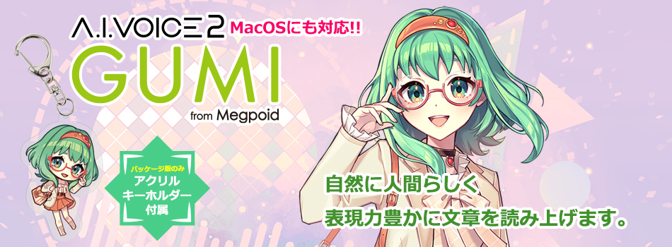 「A.I.VOICE 2 GUMI」は、歌手・声優「中島愛(めぐみ)」の声をベースに制作した、簡単に表現力豊かな音声が作成できるソフトです。 収録のボイスライブラリは、さらに自然に人間らしくなった新世代音声合成エンジンを活用したNeuralボイスライブラリ。ソフトに文字を入力するだけで、誰でも手軽に、中島愛の声質で自然に人間らしく読み上げ、音声ファイルを作成し保存ができます。 平静・喜び・怒り・悲しみのボイススタイルに対応しています。