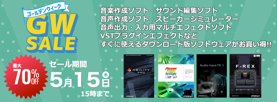 音楽作成・サウンド編集・音声入力用マルチエフェクトソフト(Audio Input FX 3)・音声出力用マルチエフェクト(PC Audio FX)・プラグインエフェクト(MS EQ COMP・F-REX・V MONITORなど)などを最大70%OFFのスペシャル価格でご提供。