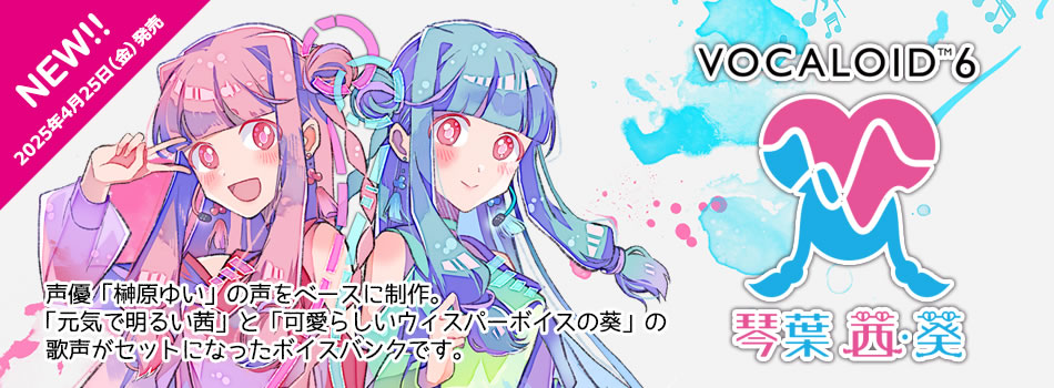 アーティストボーカル「VOCALOID6 Voicebank 琴葉 茜・葵」は、声優「榊原ゆい」の声をベースに制作した、「元気で明るい茜」と「可愛らしいウィスパーボイスの葵」の歌声がセットになったVOCALOID6専用ボイスバンクです。「VOCALOID6 Editor Lite」を付属しており、すぐに音楽制作が始められます。フルで機能をご利用になりたい場合はVOCALOID6 EditorがセットになったStarter Packをお求めください。