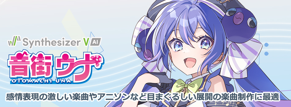 「Synthesizer V AI 音街ウナ」(CV:田中あいみ)は、人間らしくリアルな歌声での歌唱を可能とする最新のAI技術を使用して開発された「Synthesizer V」専用の歌声データベースです。メリハリやキャラ感を重視した構成は、感情表現の激しい楽曲やアニソンなど目まぐるしい展開の楽曲にも適した歌声です。