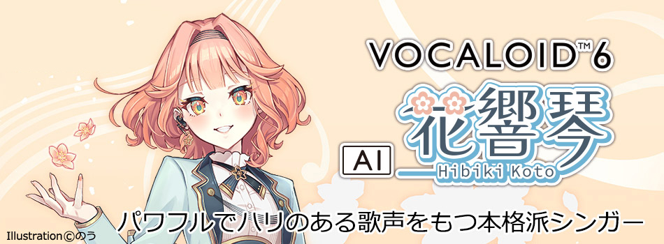 アーティストボーカル「VOCALOID6 Voicebank AI 花響 琴(Hibiki Koto)」は、パワフルでハリのある歌声をもつ本格派シンガー「花響 琴(CV:立花れおん)」のVOCALOID6専用ボイスバンクです。