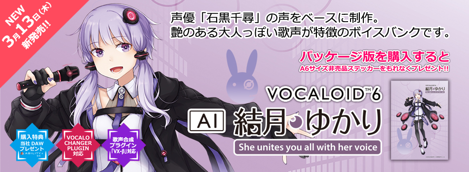 アーティストボーカル「VOCALOID6 Voicebank AI 結月ゆかり」は、声優「石黒千尋」の声をベースに制作した、艶のある大人っぽい歌声が特徴のVOCALOID6専用ボイスバンクです。 「VOCALOID6 Editor Lite」を付属しており、すぐに音楽制作が始められます。フルで機能をご利用になりたい場合はVOCALOID6 EditorがセットになったStarter Packをお求めください。