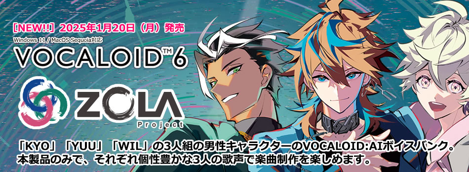 「ZOLA Project」は「KYO」「YUU」「WIL」の3人組の男性キャラクターのVOCALOID:AIボイスバンク。本製品のみで、それぞれ個性豊かな3人の歌声で楽曲制作を楽しめます。ソロはもちろんのこと、3人組のグループやデュオとして歌わせたり、他のボイスバンクと組み合わせてコーラスを歌わせたりでき、組み合わせは自由自在です。
