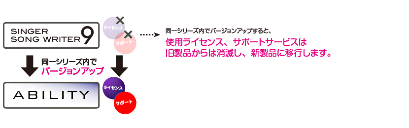 ご登録製品が「Singer Song Writer 9 Standard」で、「バージョンアップ販売」を利用して「ABILITY」を購入した場合、使用ライセンスの移行により「Singer Song Writer 9 Standard」は、再インストールや別のPCへのインストールなどで新たにライセンスを有効にする(アクティベーションする)ことはできなくなるとともに、サポートサービスも終了します。