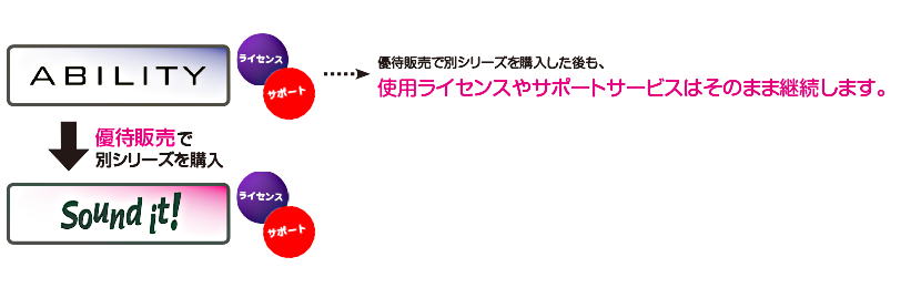 優待販売とは、現在お持ちの製品とは別のシリーズの製品を安価にご提供するサービスです。例えば、ご登録製品が「ABILITY」で、「優待販売」を利用して「Sound it!」を購入する場合は、別シリーズの製品になるため「バージョンアップ」のような使用ライセンスの移行は発生せず、優待販売の対象となった「ABILITY」はこれまでと変わらずご使用、サポートサービスを利用することができます。